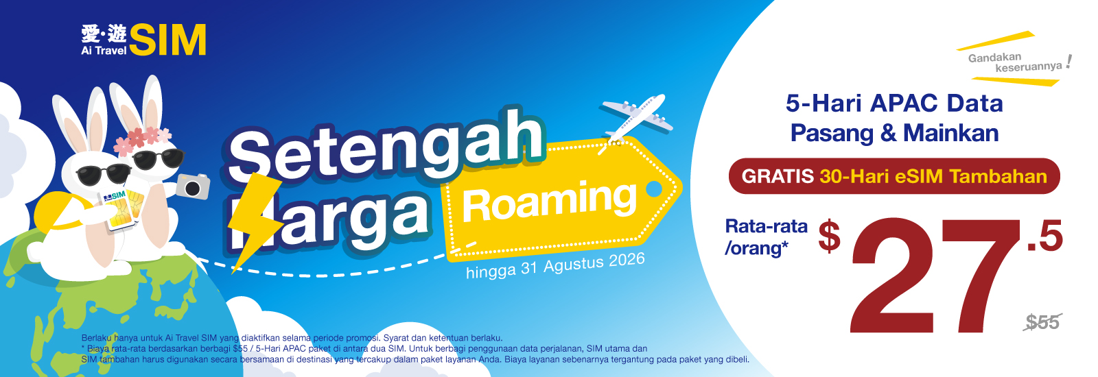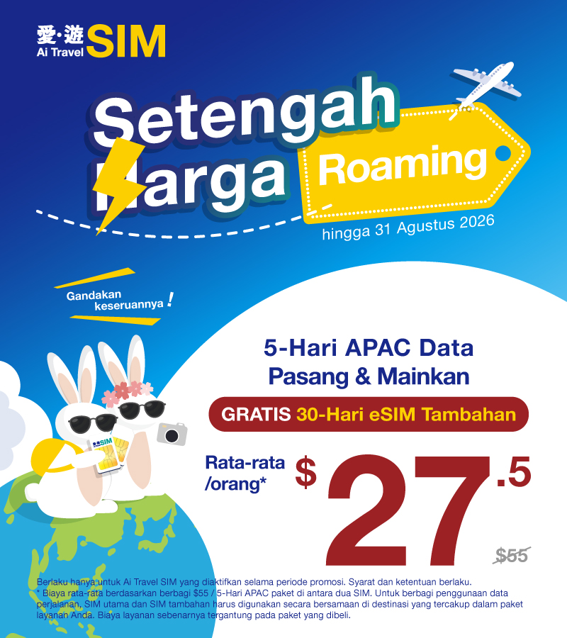 berjemur di Malaysia dan Thailand, atau menjelajahi Eropa dalam liburan panjang, tetap terhubung dengan mudah dengan Ai Travel SIM. Perjalanan bebas repot Anda dimulai di sini! 5 Hari / 5GB Kartu SIM Data Perjalanan Asia Pasifik hanya dengan $55! Nikmati 1GB data tak terbatas setiap hari dengan isi ulang mudah seharga $7 Lebih banyak pilihan roaming tersedia untuk penggunaan intensif dan liburan panjang, data unlimited mulai dari $2.6/hari Satu SIM mencakup beberapa tujuan populer. Terbang kapan saja, gunakan kapan saja untuk beberapa perjalanan selama masa berlaku Dengan jangkauan di lebih dari 100 destinasi, Ai Travel SIM menawarkan roaming data yang fleksibel, termasuk opsi harian, bulanan (30 hari), dan tahunan (365 hari). Anda dapat mengakses Facebook, Instagram, YouTube dan WhatsApp kapan saja (bahkan di China daratan) untuk berbagi momen perjalanan Anda dengan orang-orang terkasih secara bebas. |