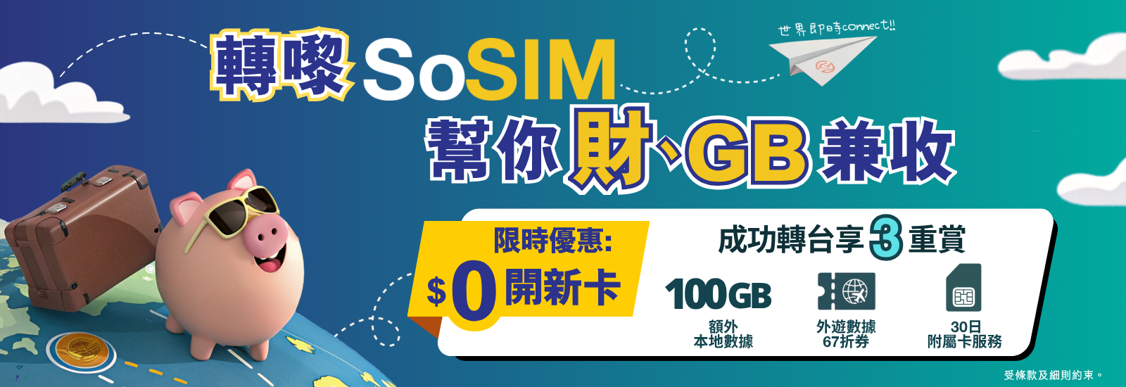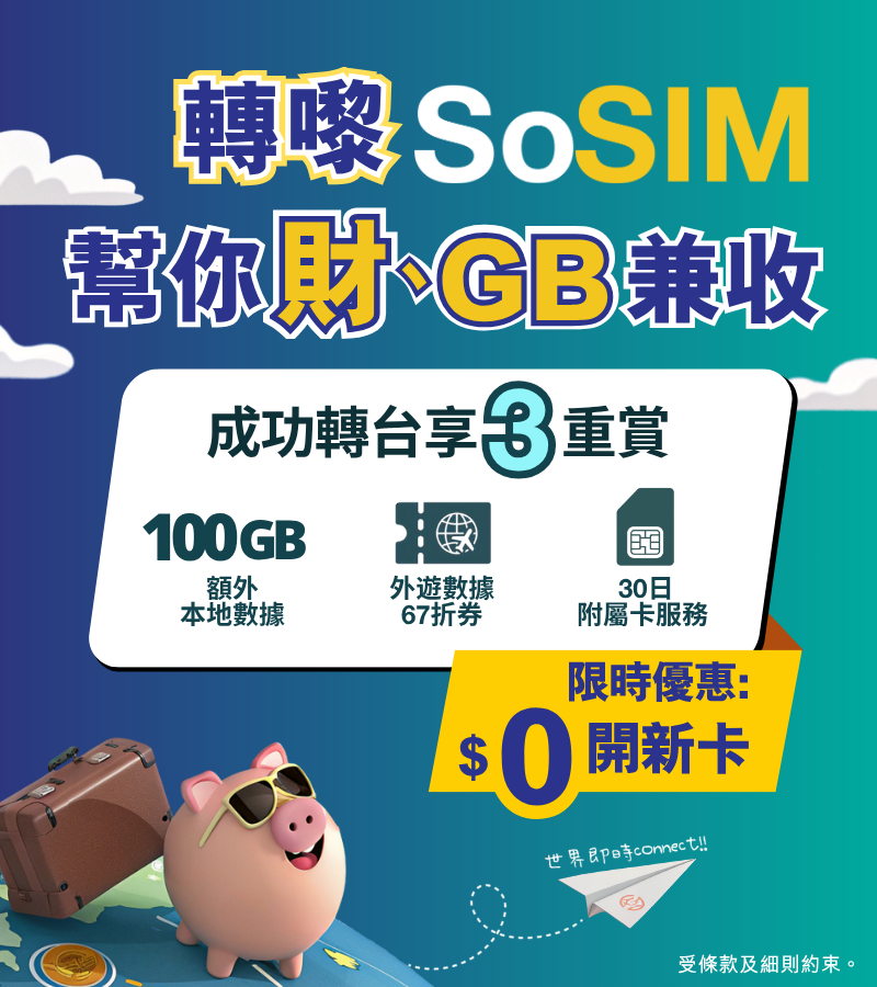 *指定全新客戶由即日起至2025年12月31日期間購買SoSIM新卡並完成實名登記制,登入SoSIM帳戶點選獎賞,輸入優惠碼換領$33 SoSIM現金券。指定全新客戶:1) 只適用於2025年10月1日或之後所購買,並已完成實名登記的SoSIM儲值卡。2)只適用於全新實名登記SoSIM儲值卡的客戶。每位客戶只可憑SoSIM 賬戶兌換1張現金券1次。