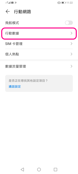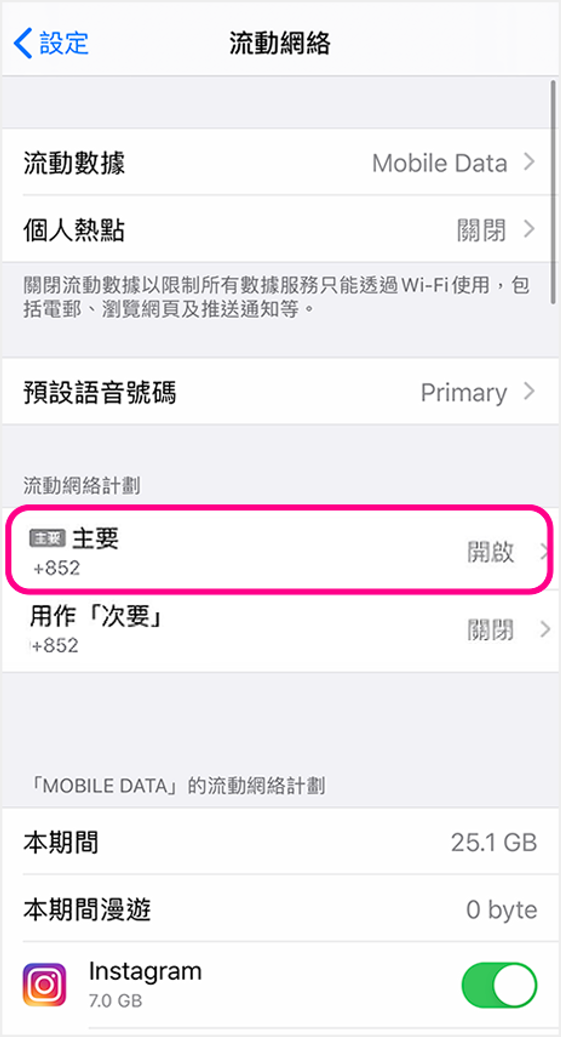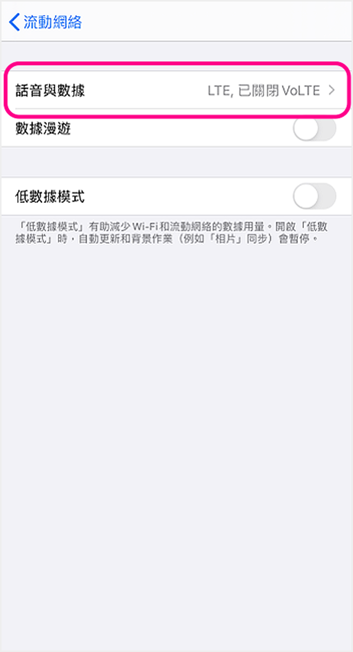 iOS (雙SIM卡) ![]() 1 進入裝置設定,點選「流動網絡」 ![]() 2 點選須開啟設定的SIM卡 ![]() 3 啟用VoLTE:點選「話音與數據」以繼續