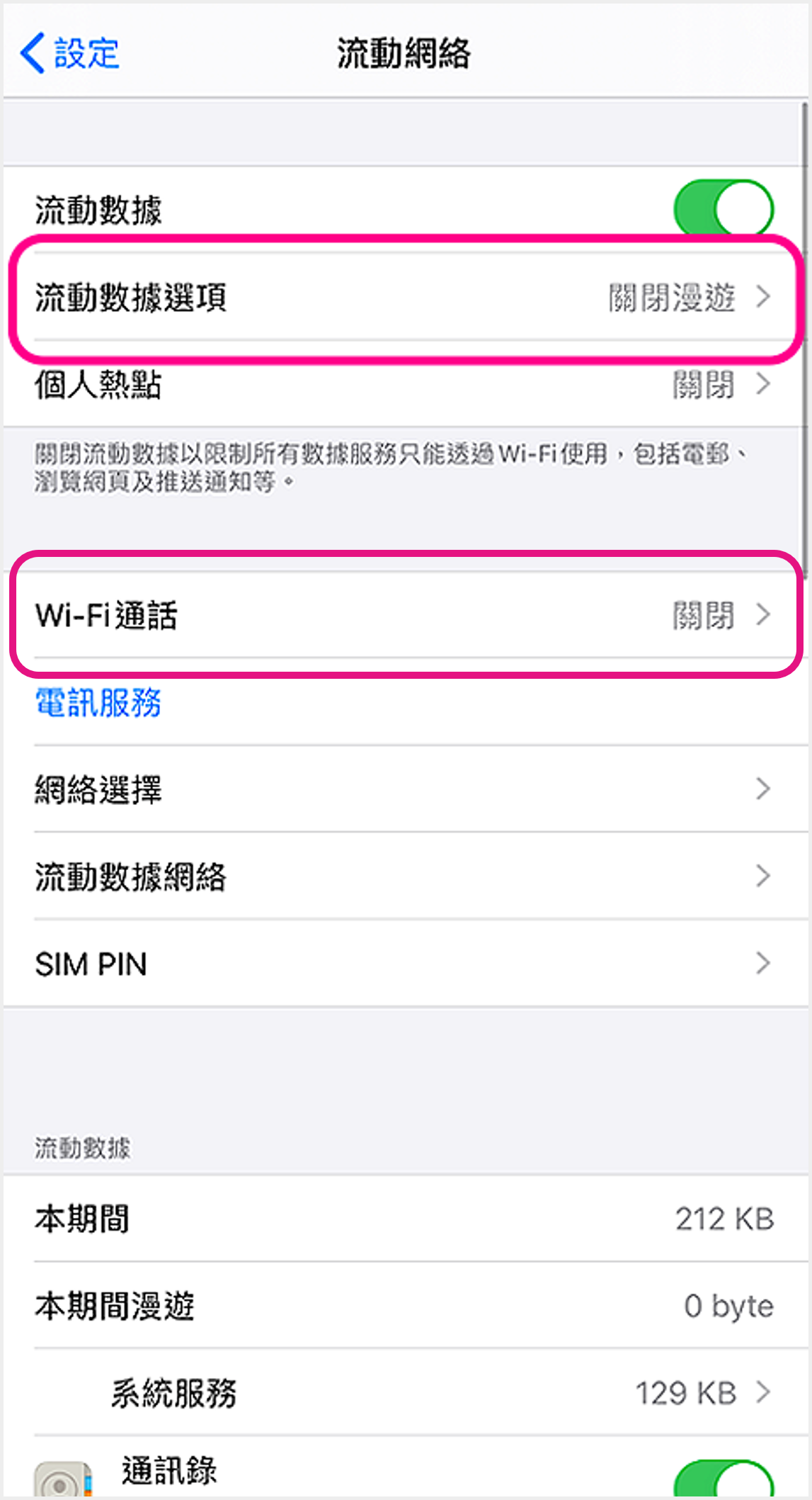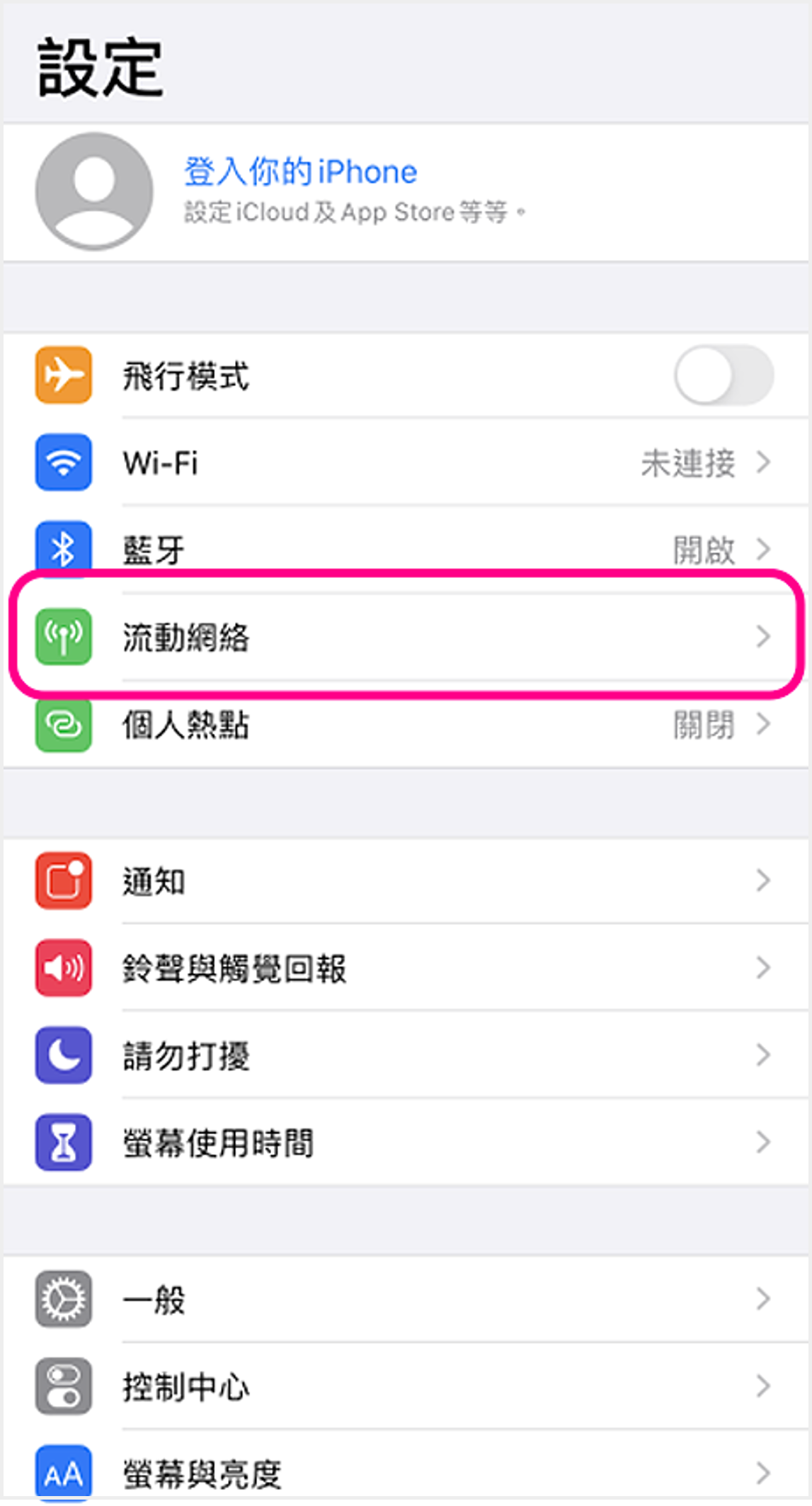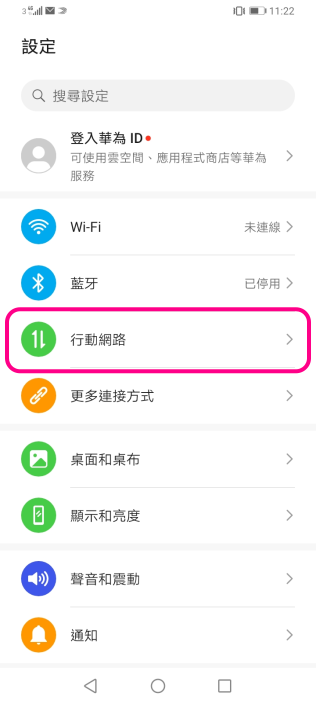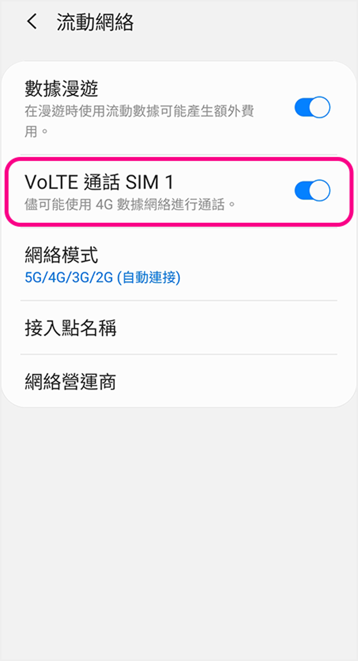 iOS (雙SIM卡) ![]() 1 進入裝置設定,點選「流動網絡」 ![]() 2 點選須開啟設定的SIM卡 ![]() 3 啟用VoLTE:點選「話音與數據」以繼續