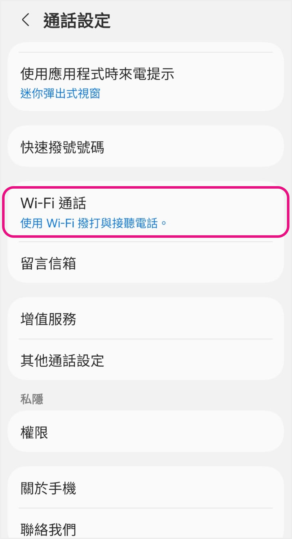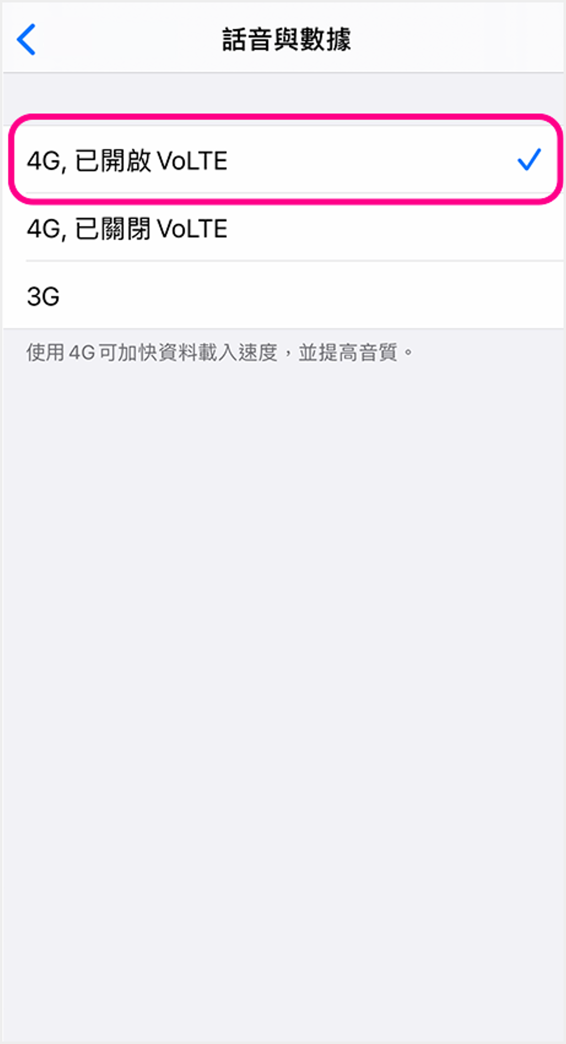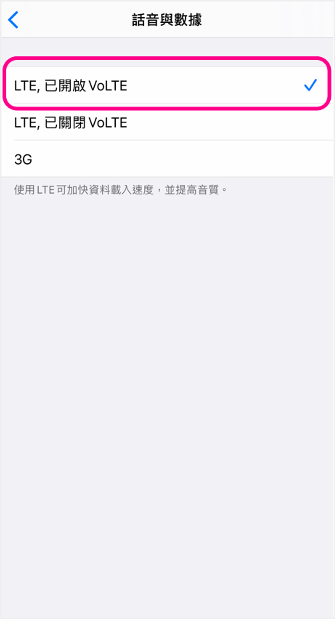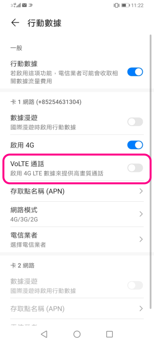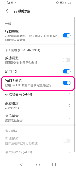 啟用VoWi-Fi:點選「Wi-Fi通話」並開啟設定即可 ![]() 4 點選「已開啟VoLTE」即可啟用VoLTE |