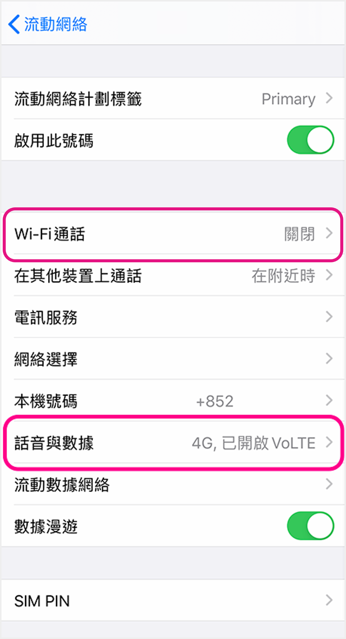 iOS (單SIM卡) ![]() 1 進入裝置設定,點選「流動網絡」 ![]() 2 啟用VoLTE:點選「流動數據選項」以繼續 啟用VoWi-Fi:點選「Wi-Fi通話」並開啟設定即可 ![]() 3 點選「話音與數據」 ![]() 4 點選「已開啟VoLTE」即可啟用VoLTE |