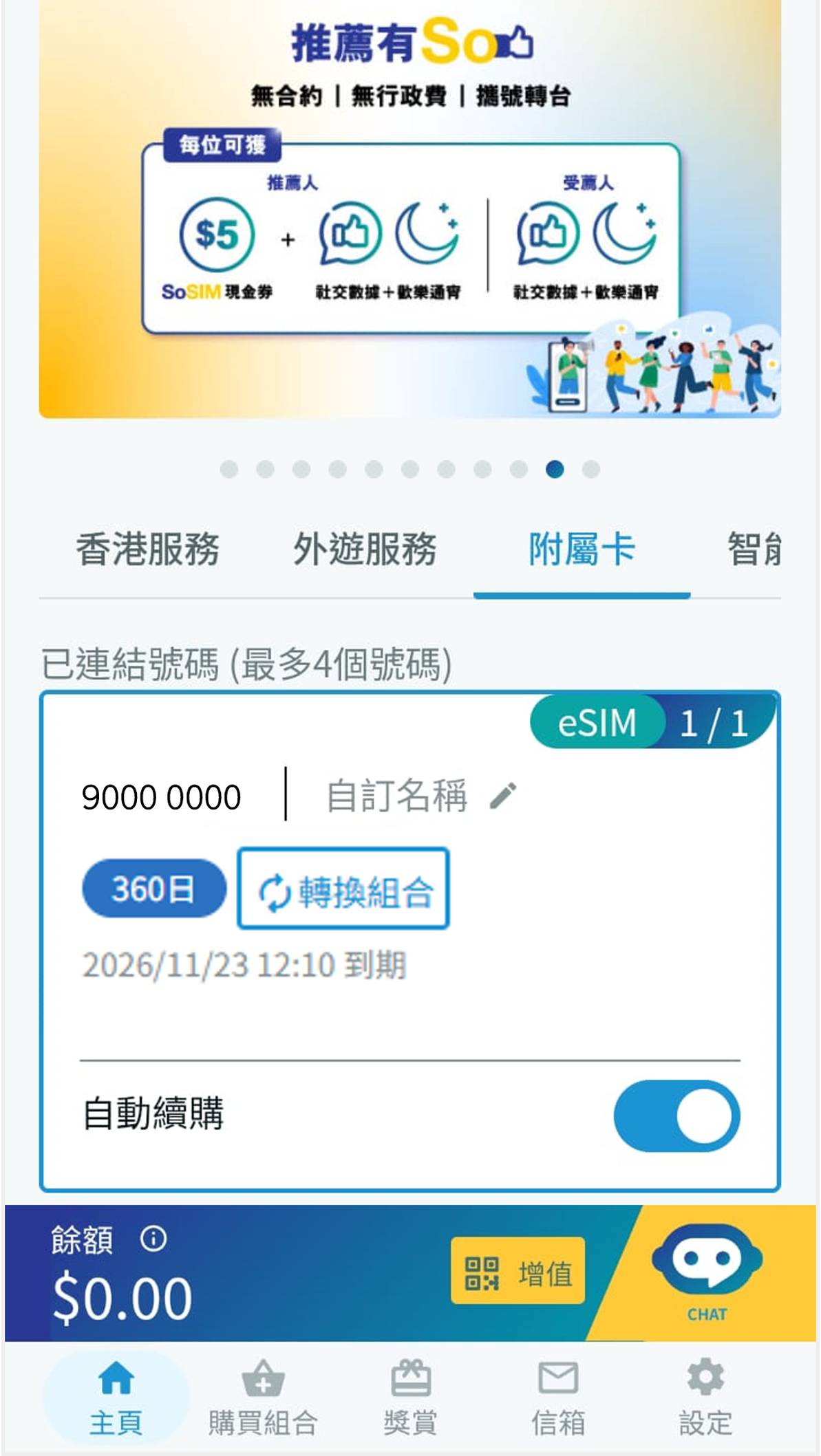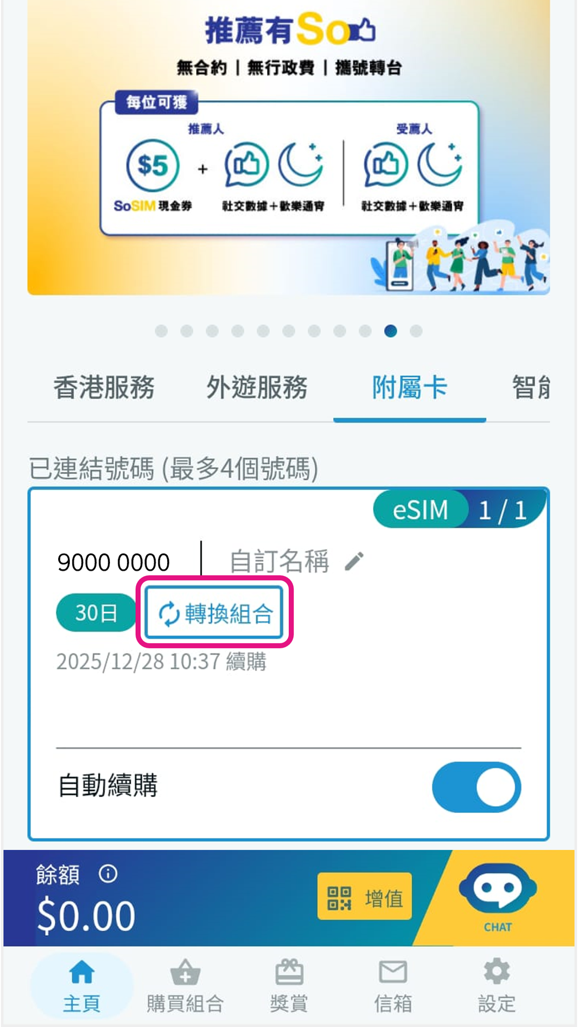 (功能包括為附屬卡實名登記、查看服務組合有效期、更改自動續購設定及自訂附屬卡名稱) 購買實體附屬卡:須於自選生效日期或之後插卡入流動裝置以啟用 購買eSIM附屬卡:掃描傳送至已驗證的電郵地址的二維碼以安裝並啟用 轉換附屬卡組合(號碼不變)你可按照以下教學購買並轉換為不同續購周期的附屬卡服務 (如由30日轉換為360日)。 ![]() 1 於 主頁 > 附屬卡 內選擇你須轉換組合的附屬卡,然後按「轉換組合」