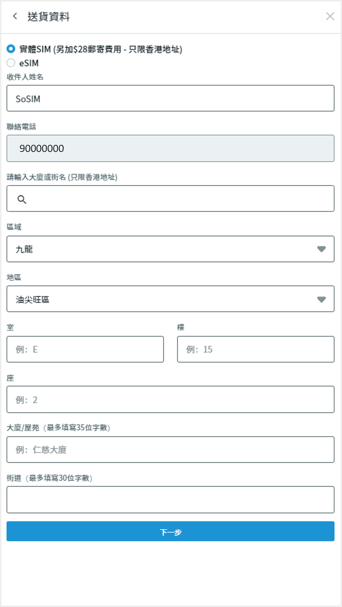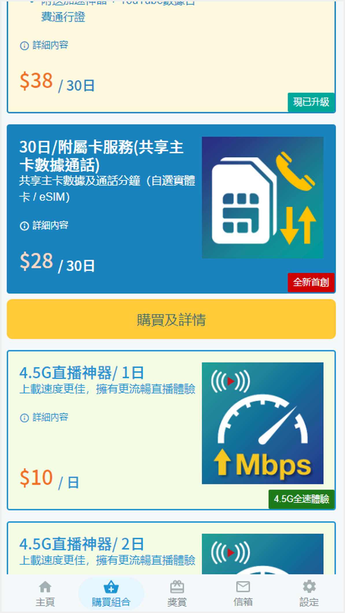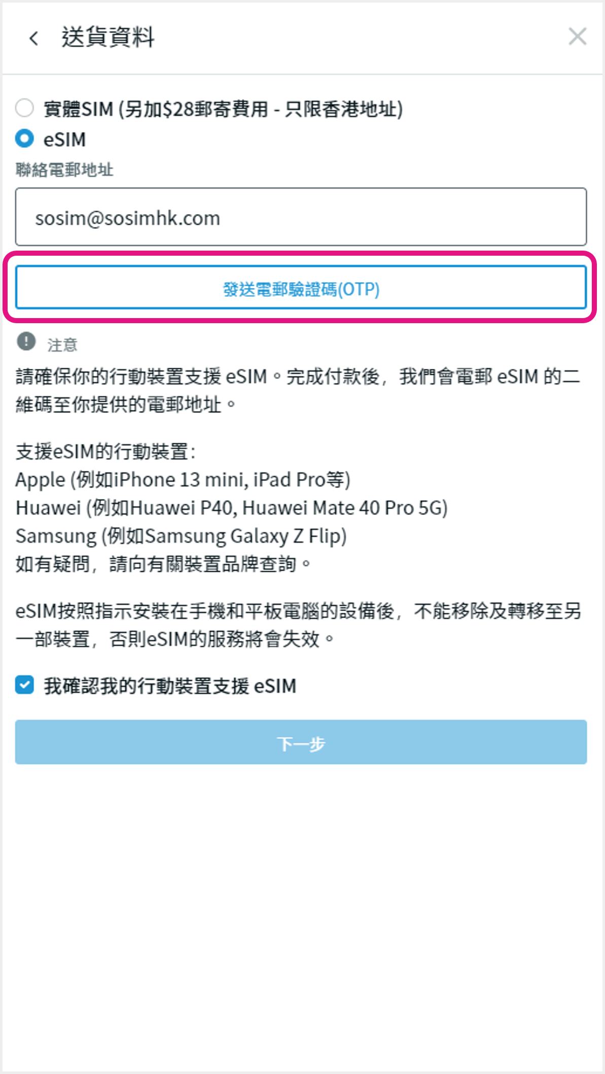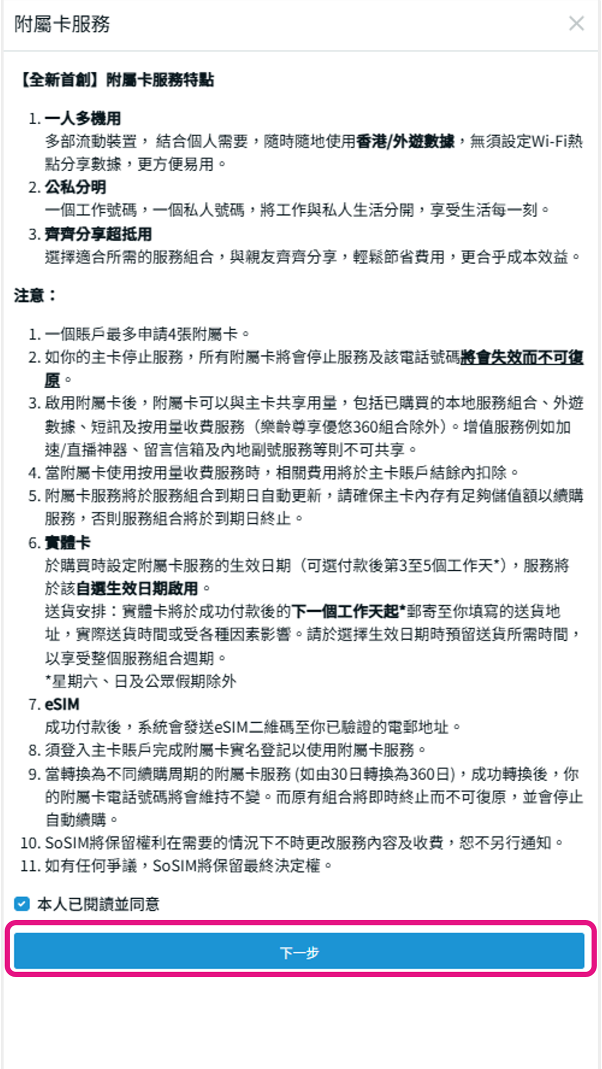 附屬卡兌換方法 ![]() 1 登入賬戶後,於 購買組合 > 「香港服務」,選擇30日附屬卡服務 ![]() 2 參閱注意事項後剔選方格以確認同意,再按下一步 ![]() 3 如換購eSIM,須點選「eSIM」,並輸入電郵以獲取一次性驗證碼(換領二維碼將會發送至該電郵地址) 參閱注意事項後剔選方格以確認同意,再按下一步 ![]() 4a 如換購實體卡,須點選「實體卡」,並填寫送貨資料(即收件人姓名及香港郵寄地址) 提示:換購實體附屬卡須另付運費 ![]() 4b 選擇實體附屬卡的生效日期(可選付款後第 3 至 5 個工作天,星期六、日及公眾假期除外)。服務將於當日啟用