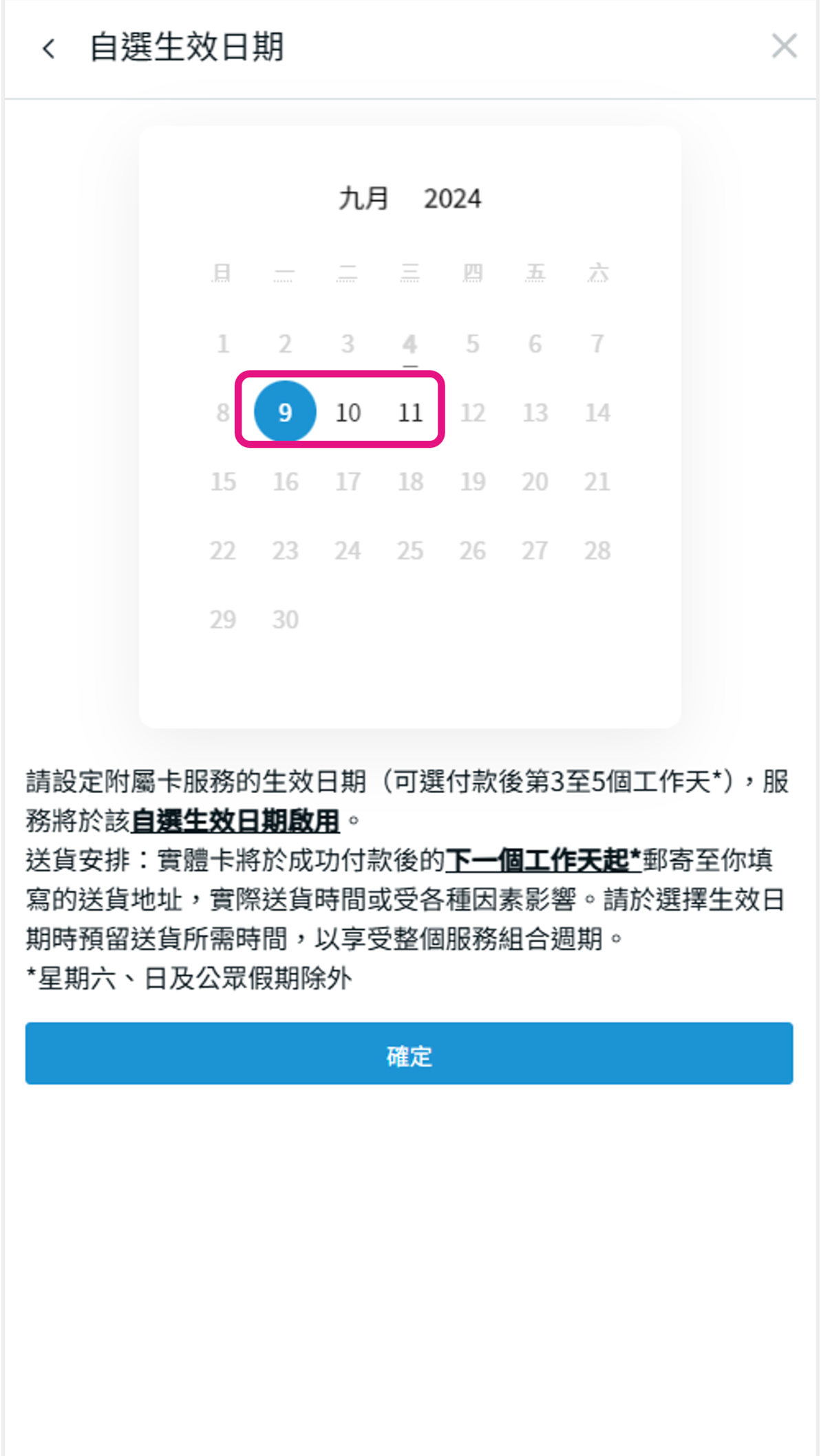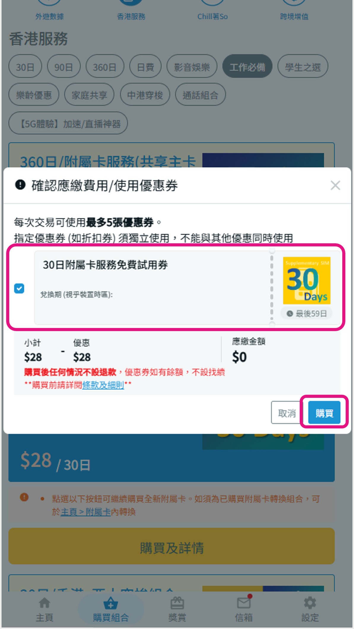 然後點選「確定」 ![]() 5 剔選使用附屬卡優惠券,即可扣減首30日服務費用。然後按「購買」繼續付款