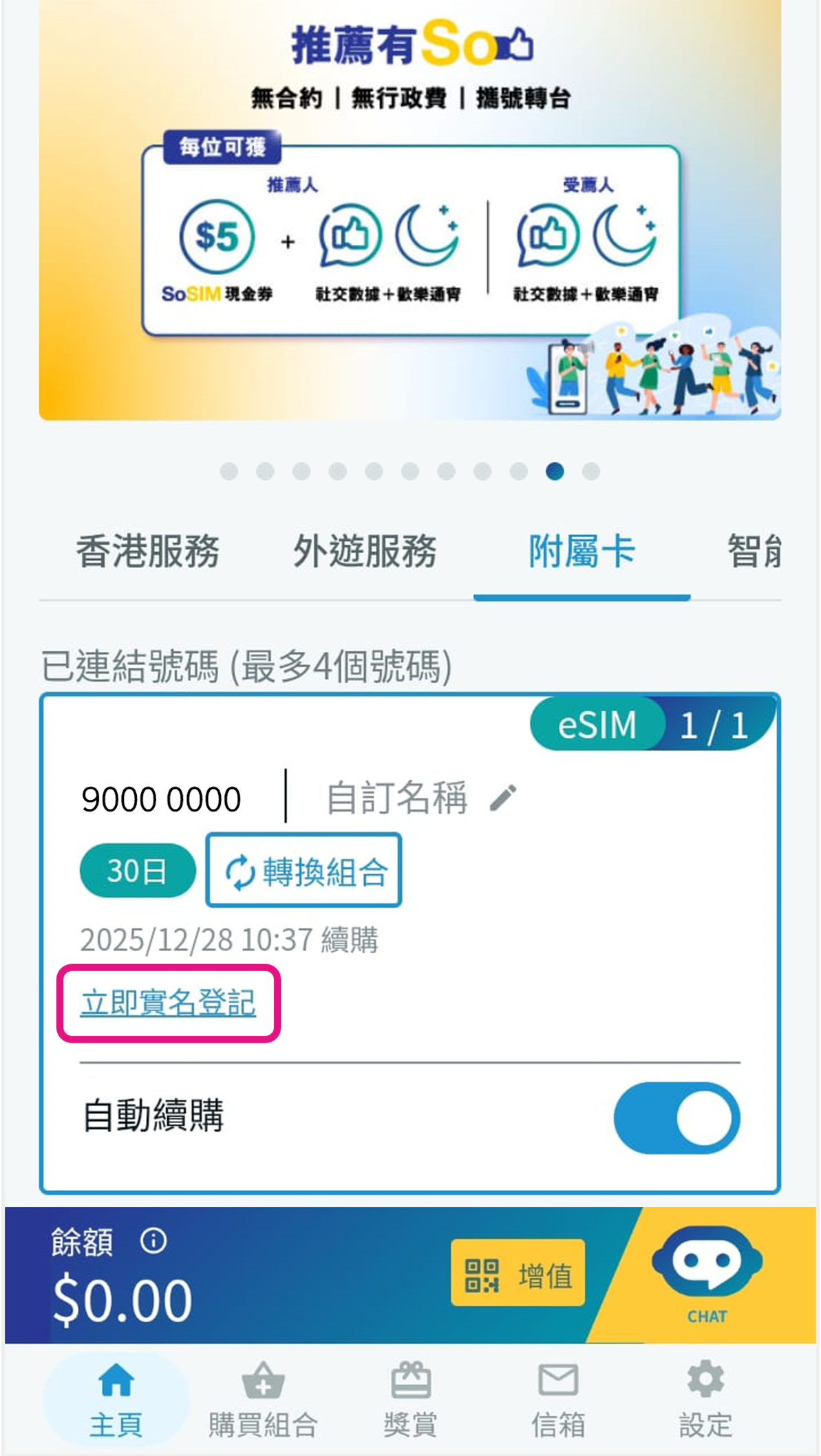 ![]() 6 成功付款後,可透過主卡賬戶,於主頁 > 附屬卡 內管理附屬卡服務 (功能包括為附屬卡實名登記、查看服務組合有效期、更改自動續購設定及自訂附屬卡名稱) 實體卡:須於自選生效日期或之後插卡入流動裝置以啟用 eSIM:掃瞄傳送至已驗證的電郵地址的二維碼以安裝並啟用 |